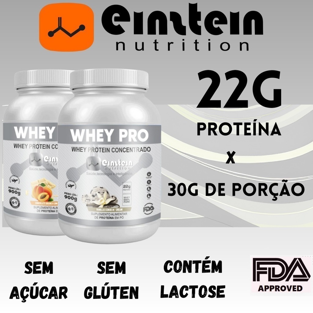 O kit contém: 02 potes de 900g cada de Whey Protein Concentrado Einstein Nutrition sabor Chocolate Branco com Damasco